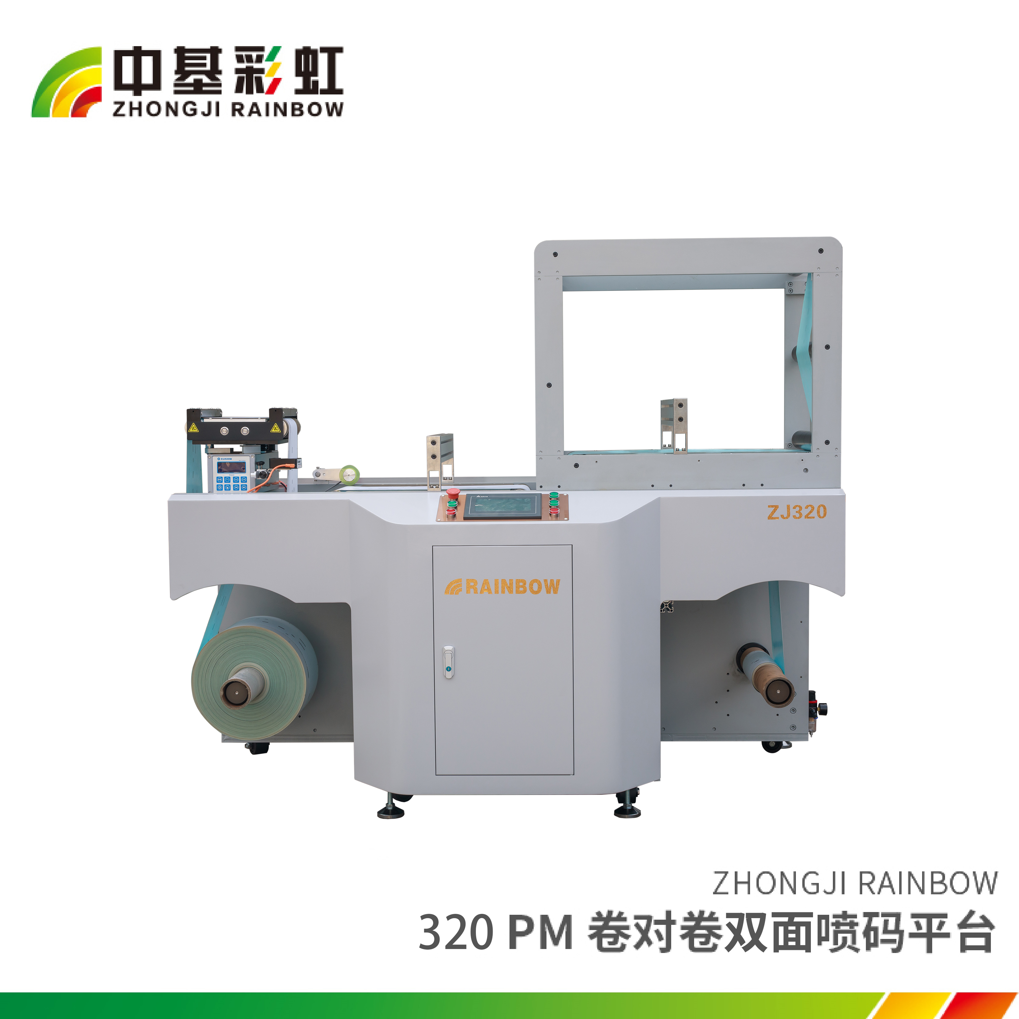 自主研發高效率噴碼平臺、全伺服收放卷錐度張力系統,進口糾偏系統,觸摸屏控制系統,可以在紙張、不干膠、PET、PVC、PE、PP等多種承印物表面噴印各種個性化信息,包括中文、英文數字、一維條碼、二維碼等。